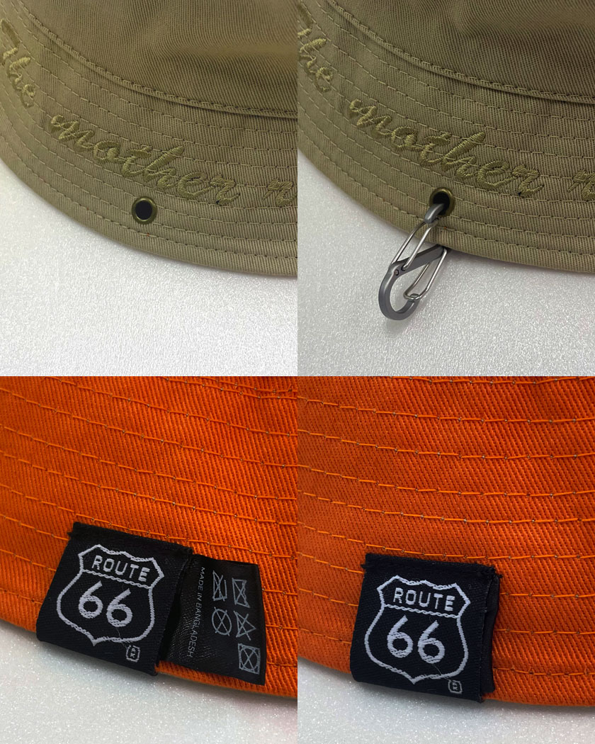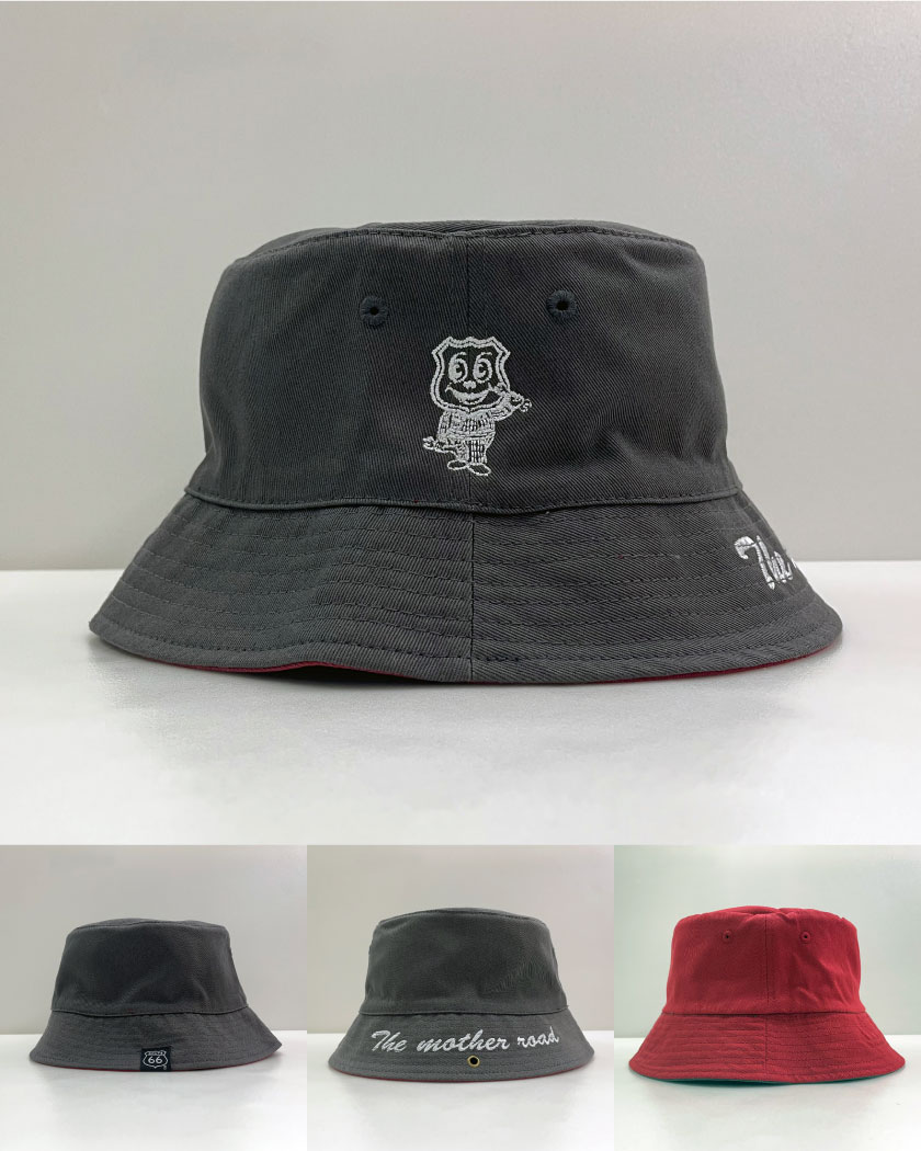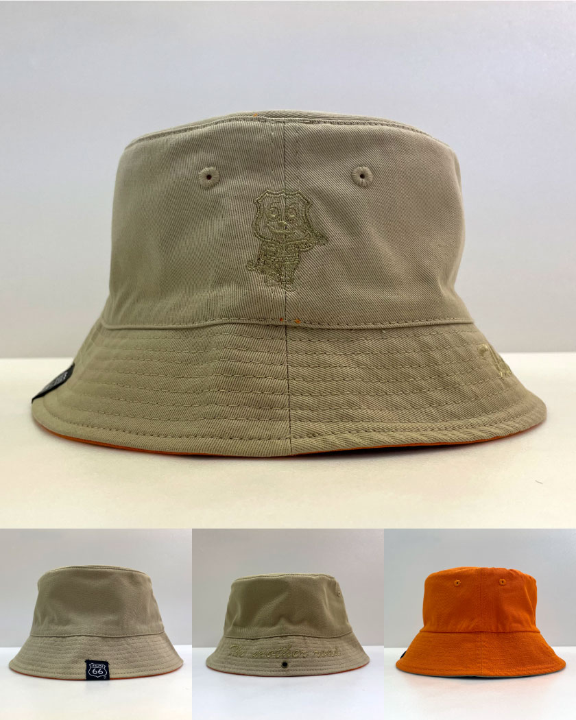 ルート66オフィシャルキャラクターをさりげなく刺繍した、流行のバケツハット。リバーシブルなので1枚で2枚分のコーディネートが可能。カラビナを通せるハトメがあるので、ヘルメット着用時はベルトにひっかけておけるのが地味に便利なポイント。